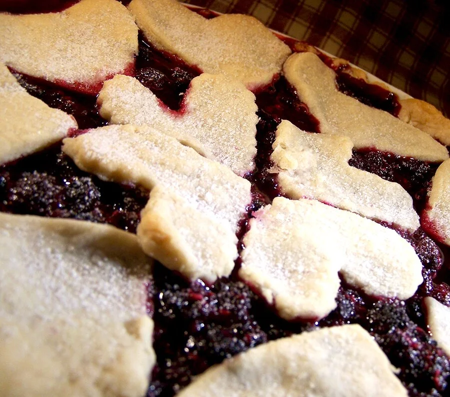 At this point you could just cover your pie with the top crust, pinch edges closed and trim any excess. I chose to cut out heart shapes for my top crust. I used a medium heart-shaped cookie cutter for the outer edges and a smaller cutter for the inside hearts. Cut out the hearts from your second round of dough. Cut them out as close together as possible. You don’t want to re-roll your dough, which can lead to a tough crust. Place the hearts in a circular pattern around the edges of your pie and place the smaller hearts in the center.